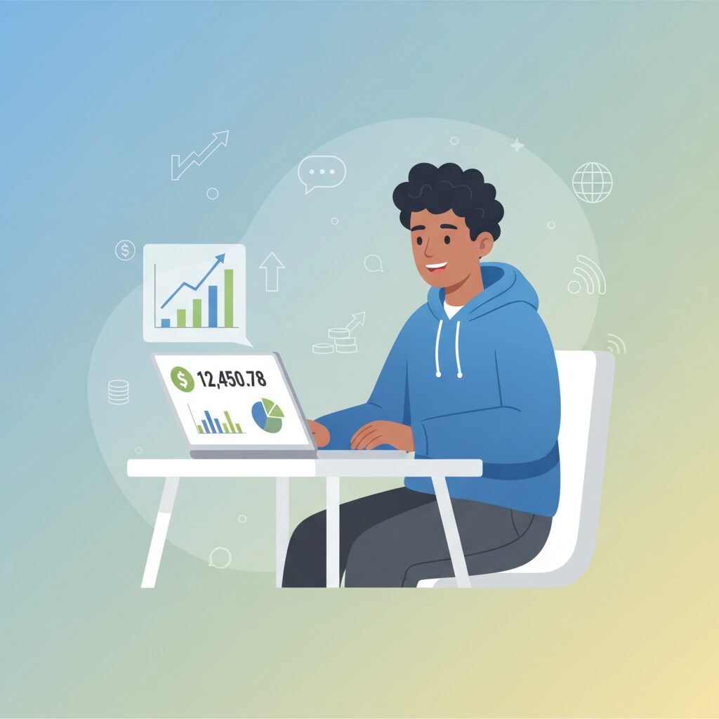 A young American professional sits at a modern desk, focused on a laptop screen showing rising earnings and clean charts, symbolizing simple and reliable online income opportunities in a calm, trustworthy setting.